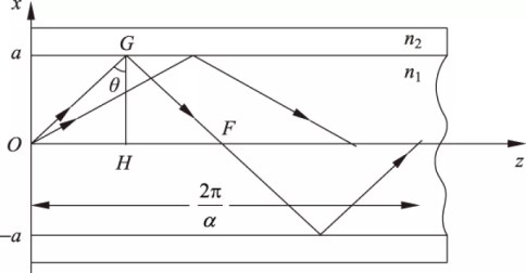 我们在图6的阶跃折射率多模光纤中选取光线OGF进行分析,假定它的空间周期也为2π/α,则有