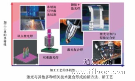 就拿激光焊接技术来说,在激光复合工艺的发展中已出现了如双点或双束激光的复合、激光与电弧的复合、激光与搅拌摩擦热复合以及激光与电阻热复合等形式;并呈现与其他相关技术结合及功能延伸的趋势,如与水射流、铆接等结合而形成的新工艺(见图)。