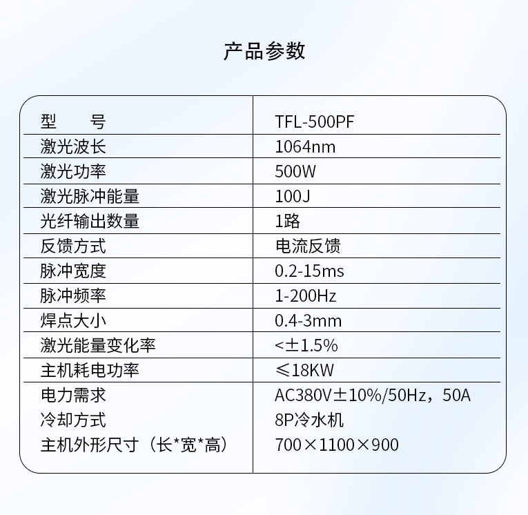 TFL-500PF大功率光纤传输激光焊机可应用于钛、镍、锡、锌、铜、铝、铬、铌、金、银等多种金属及其合金,及钢、可伐合金等合金的同种材料间的焊接,也可应用于铜-镍、镍-钛、铜-钛、钛-钼、黄铜-铜、低碳钢-铜等多种异种金属间的焊接。