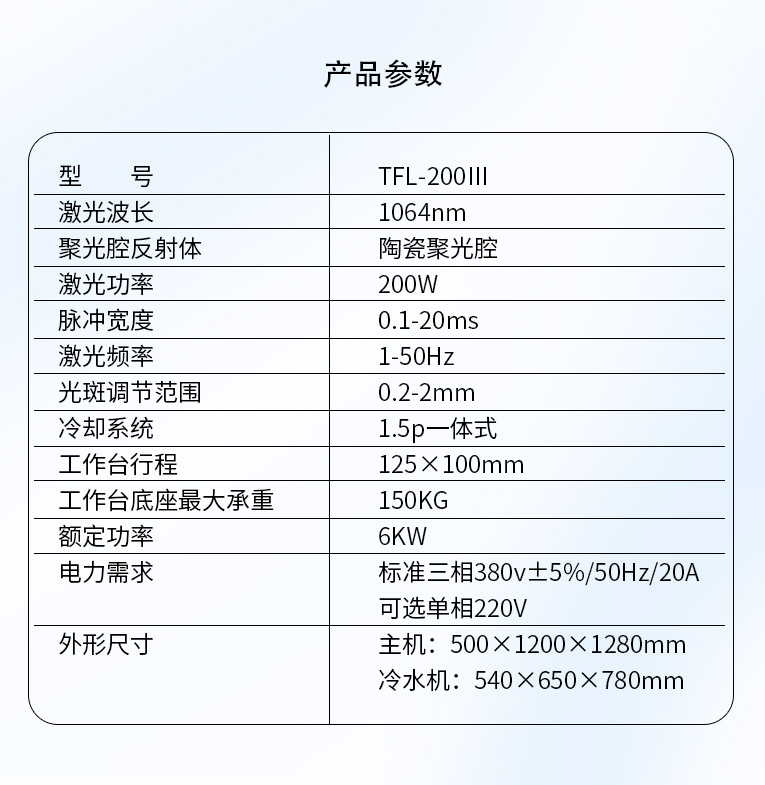 环境湿度:不高于80% 。因为焊机电源打开后,激光晶体就会持续的被冷却系统冷却,因为冷却水一般会低于室温,当环境湿度过大的时候,而激光晶体的温度又低于室温,这时激光晶体的两个端面上会凝结水雾,当激光输出的时候,这些水雾会大大降低激光输出能量,而且这些附着在激光晶体端面上的水,干了以后,会在激光晶体的膜面上留下痕迹,这将会大大加快激光晶体膜面的老化。所以,为了防止这种情况的发生,冷水机的水温设定,夏天不可以低于室温3度,冬天不可以低于5度。