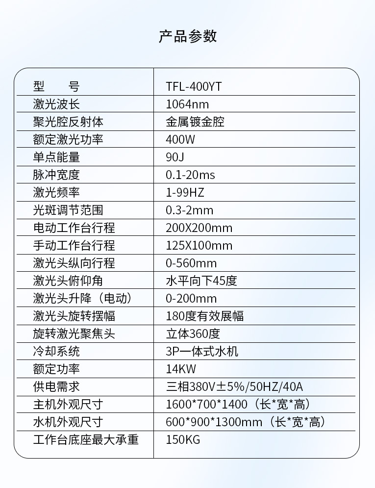 安博(中国)激光一体式模具激光焊机TFL-400YT是一款多种功能融合一体的新型模具激光焊接机,针对特大型塑料模具激光焊、中型注塑模具激光烧焊、小型塑胶模具激光补焊、压铸模激光补焊具等各类模具可实现超精密修复,帮您解决大型汽车模具修复难题,不需要模具移动,电动工作台与立体旋转激光头完美结合,操作杆控制运动移动实现轻松激光修复大型模具,同时也保留了传统手动工作台超精密修复模具功能。