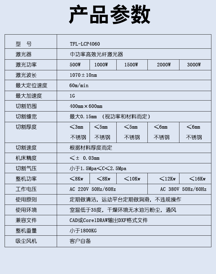 激光功率 | 500W | 1000W | 1500W | 2000W | 3000W |