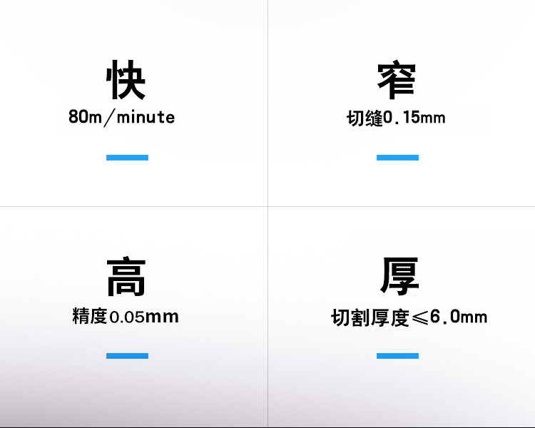 适用范围广,可加工铜、铝、不锈钢、铁、pcb板、磁性材料等多钟材料。幅面大小可选,长度可根据用户加工需求定制。切割速度快,效果光滑平整,切口没有机械应力,光滑平整无剪切毛刺。