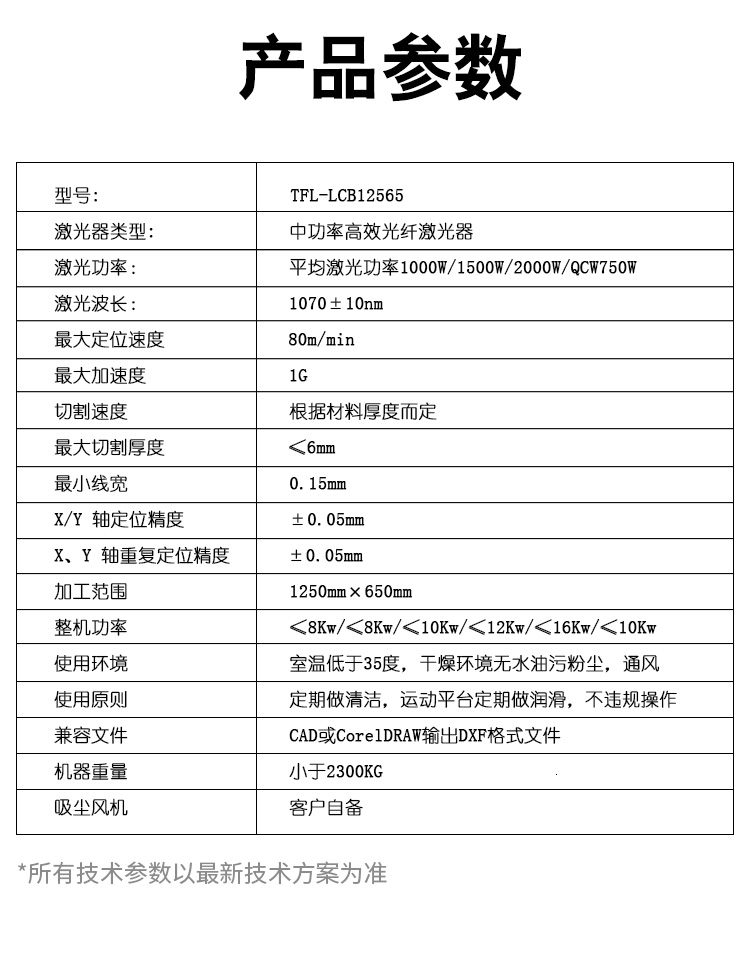 长期推荐最大切割厚度 | ≤2mm (铝板) ≤3mm (铝板) ≤4mm (铝板) ≤6mm (铝板) ≤6mm (铝板) ≤2mm (紫铜板) |