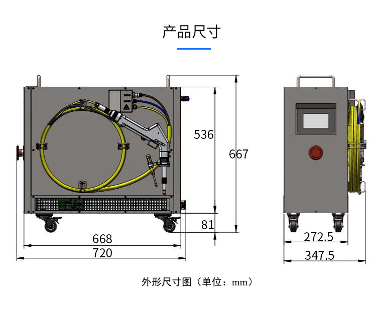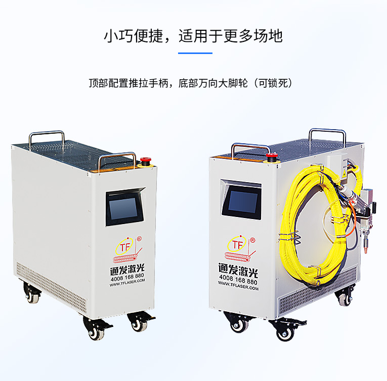 占地面积小 灵活方便 一体式设计,激光器、水箱、控制部分组合在一起,占地面积小, 对场地要求低,配备移动滑轮,可根据现场要求,随时调整工位, 方便灵活。 手持式焊接头,传输光纤可选10米,突破工作台的局限,可达 焊接范围更广,适用 于各种复杂焊缝,可以对工件任意部位、角度 进行激光焊接加工。 |