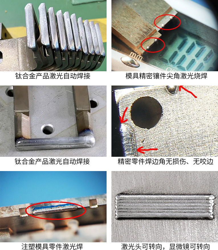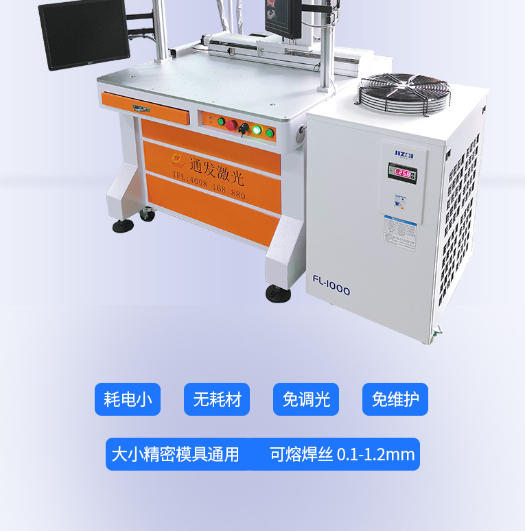 1、采用光纤激光器,反射率高,能量强,免维护,免调光,功耗少,相比传统 模具焊来说,体积小,安全,稳定性好超长使用寿命。