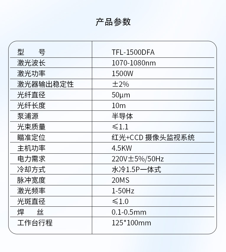 采用光纤激光器,反射率高,能量强,免维护,免调光,功耗少,相比传统 模具焊来说,安全,稳定性好超长使用寿命。 1500W光纤激光器,满足铜、铝焊接量大的模具及安博官方网页版焊接加工需要。 高承重底座及工作台,保持轻便灵活的优点,同时提供更高承载能力。 配备.1.5P大功率一体式水冷水机,保证了大功率焊接的稳定性。